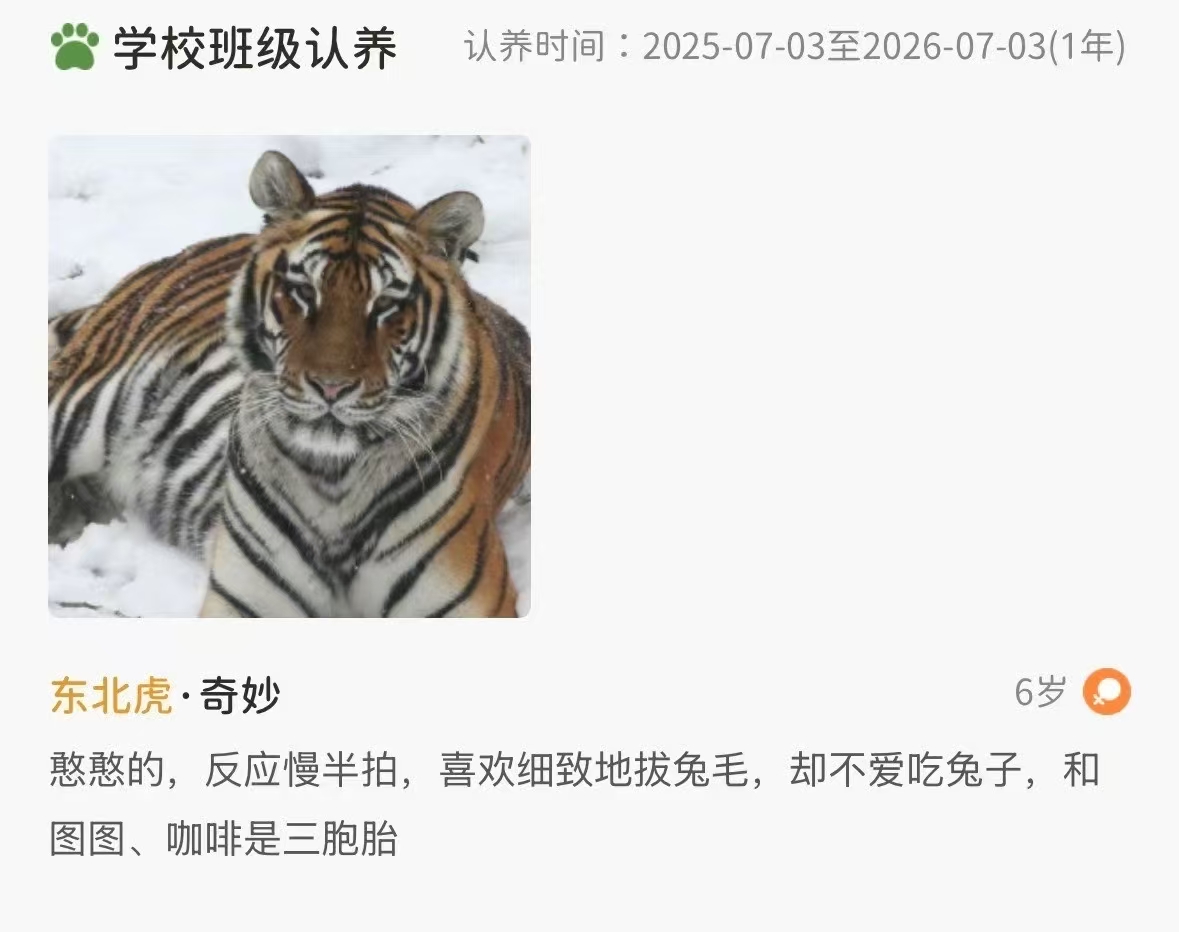 在二年级即将结束的时候,得知三年级要重新分班,向日葵班的回忆就要留在2025年的夏天了。小朋友、家长、老师们都有很多的不舍。最终孩子们提议通过共同认养一只东北虎给二年级的生活画一个句号。